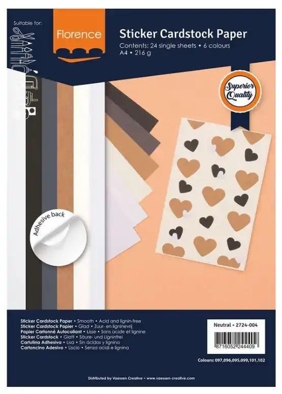 Der selbstklebende Cardstock hat eine glatte Oberfläche und eine Stärke von 216 g/m².24 Bögen in DIN A4, je 2 Stück von insgesamt 6 FarbenDer selbstklebende Florence-Karton ist mit einer breiten Palette von Tinten und Druckern kom